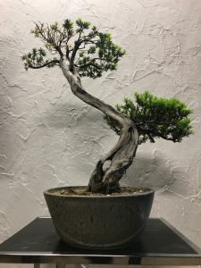 これはイチイの木で舎利がきれいにはいっており、盆栽店の方から石灰硫黄合材をおゆずり頂き、塗布する事で更に白くさせたものです。冬を越えて先端部分がちょっと枯れております。ちなみに枝が白骨化した部分のジンや幹を削り白骨化した部分を舎利といい、ダイナミックな出来になります。