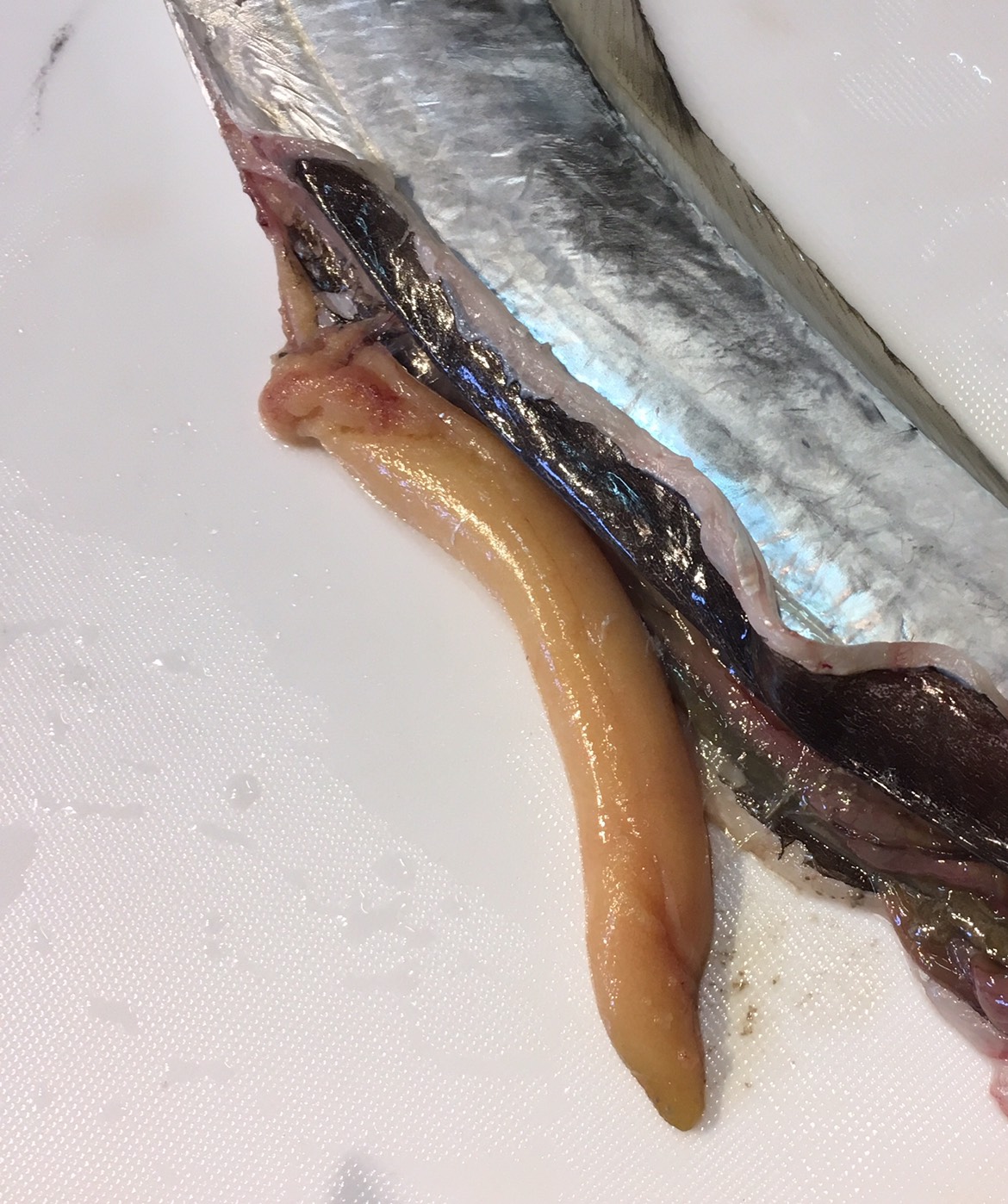 案外きれいに内臓が取れ、あら!わたし意外とやれる!と思ったら、なにやら黄色っぽい長い物体が・・・!