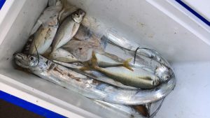 その日の釣果であります立派なタチウオやアジ、なんと、私たち社員にも分けていただきました!!