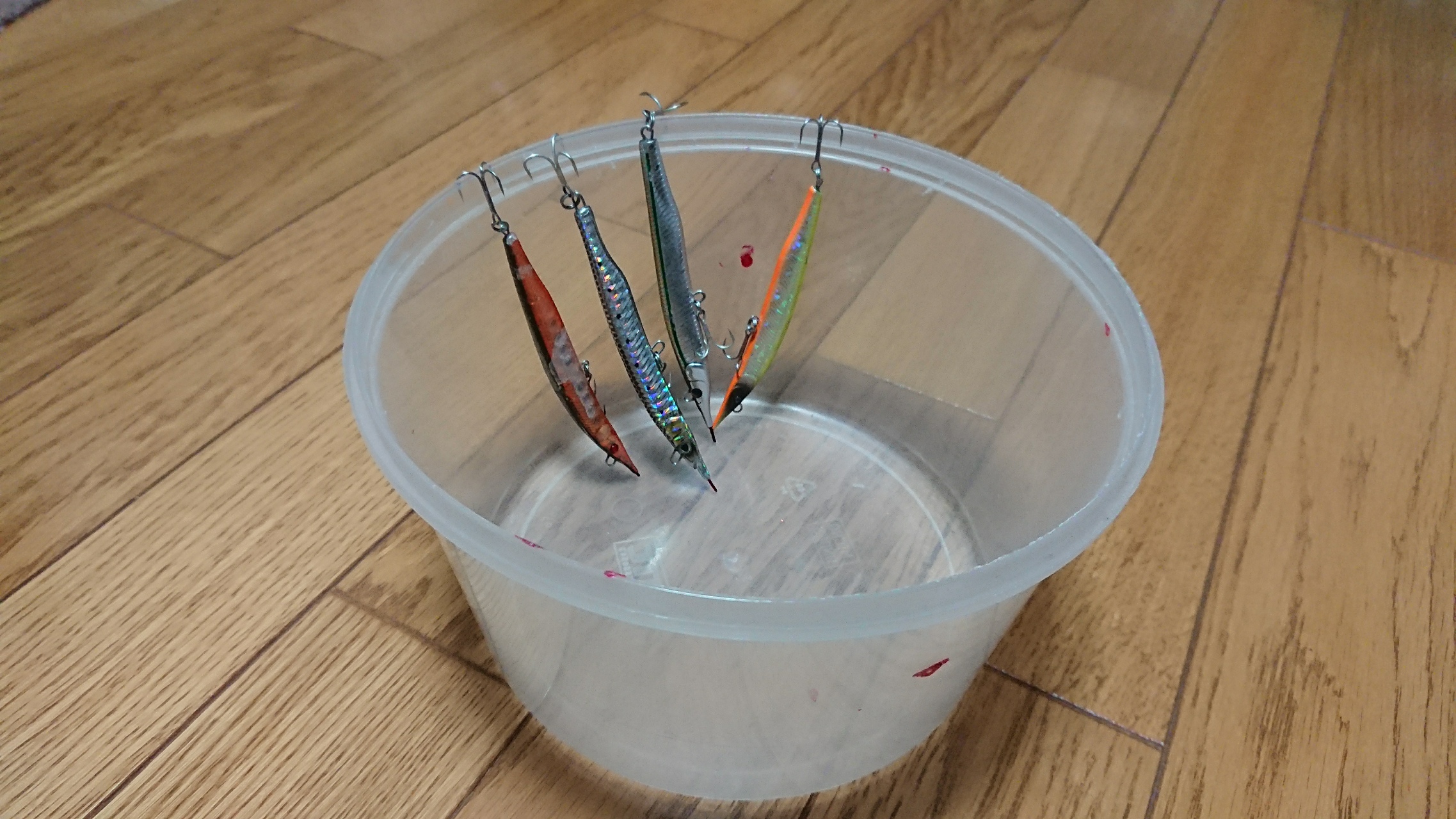 次に、ルアーです。小型の洗面器的な容器に使用したルアーを入れます。こちらも水洗をシャワーに切り替えて、全体的に水を掛けます。何度か、洗面器の水を入れ替えれば洗浄は終了です。そして、完全に塩抜きをするために翌日まで水に浸けておきます。翌日、水を良く切ってから洗面器の淵にフックを引っ掛けて乾燥。