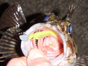 ソイは結構ミノーなんかでも釣れることが多く、表層~中層でもバイトが出ることがあるが、カサゴに関しては圧倒的にボトムでのバイトが多い。