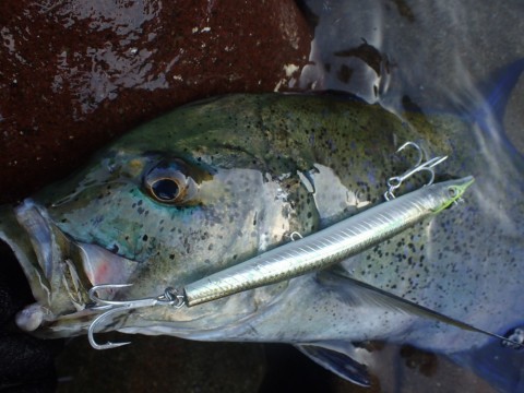 前日のショートバイトが多発したこともあったので、トレブルフック×2での仕様にし、表層スキッピングにてアピールしていきます。開始、早々に何かしらのチェイスやバイトがでますが、フッキングまで至らず。トレースする場所がリーフ上ってこともあり、根掛かりが嫌でフォールさせる時間を1秒もとっていなかったのですが、意を決して数秒のフォールの間を作り、やっとのフッキングです。