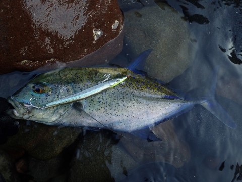 この時期のトカラ列島では、各島にトビウオが接岸し、夜間になると、それを捕食するためにロウニンアジ(GT)が堤防から届く範囲を回遊し始めます。そんな夜の堤防GTも魅力的ではありますが、青色がキレイな魚体の「カスミアジ」のデイゲームも遜色ないくらいに魅力的なものがあります。