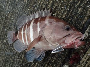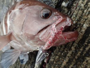 湾内でのロックフィッシュってこともあり、割とライトめなタックル(PE0.8号と0.6号)を準備してきたのが裏目にでてしまい、根掛かり後の生還率は低く、根掛からないことを祈りながら、キャストと結び直しを繰り返していきます。