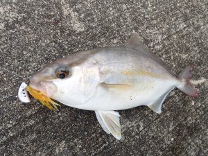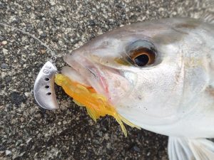更なる飛距離を求めて、10gのジグヘッドへと変更し、遠投すること数投…。フォール中に再びモゾモゾする何かに、「どえらっしゃい」とフッキングで上がってきのが、こちら。