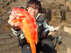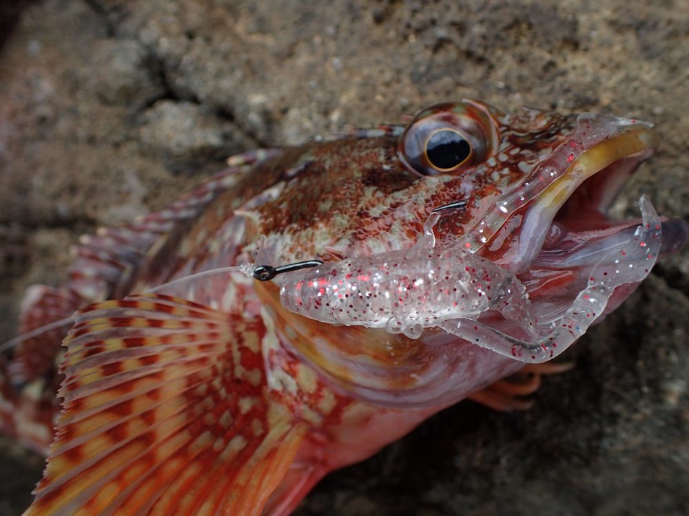 朝一は「ヒラスズキリベンジを…」と意気込んでいましたが、波は穏やか、打てるサラシは皆無の絶好の釣り日和でしたので、リベンジ未達成となり、ロックフィッシュゲーム開始です。