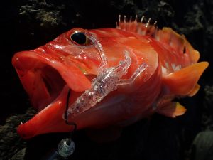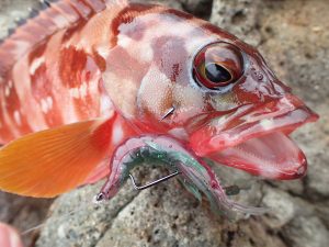 以前は、シンカーの重さは21~28gを選択していましたが、この日は17gでも十分に着底をできる程のノンビリとした潮でした。夏が盛期のアカハタなのでピーク時よりは反応が鈍くなるのは当然かもしれませんが、この日も「MODELISM-EBI」のクリアラメに良く反応してくました。沖のアカハタよりも体色が濃く?ハッキリ?としているのは、沖より浅いとこにいるために日焼けでもするのですかね?