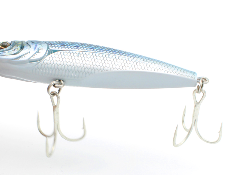ただただ水面を割らないスピードで泳がせば、よたよたとしたスラロームアクションで確実に捕食できるベイトを演出します。フラットベリー形状が水中で水流や水流の変化に乗るように設計されておりシンキングペンシルの中では極限までスローなアクションを可能にしています。流れのあるポイントではラインを出しながら、レンジを保ちながらドリフトさせアプローチする事も可能です。また、後方にズラリとウエイトを配置し、ストレスの無い気持ち良い飛距離を実現。更には、ワイヤー貫通、大型フック仕様とモンスター攻略に心強いファクターも備えています。カラーは全色こだわりのリアルプリントを採用。ナチュラルカラーには特殊ホロをアピール&グロウカラーにはレーザーホロを採用しています。モンスターを惑わすアクションを製品名にしたリアルルアー。それがデッドスロースラロームです。