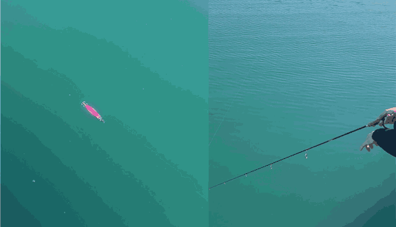 Even with a slow lift of the rod (long jerk), the lure produces an S-slide lift action.This presentation also approaches squid by transitioning from a fleeing baitfish movement into a controlled fall.
