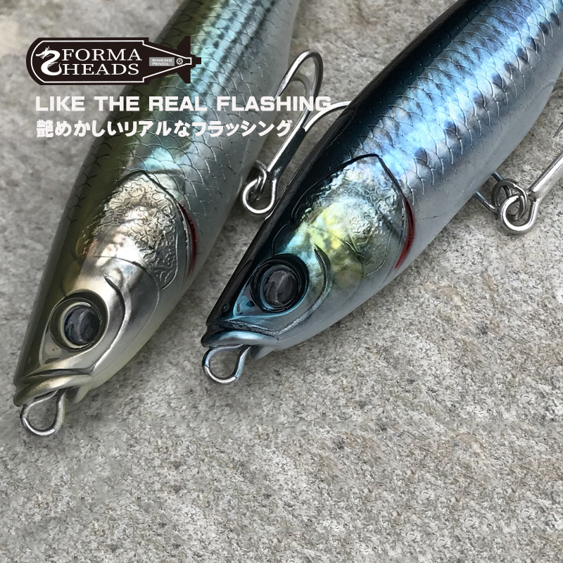Forma HEADS is a sinking pencil which is a wire penetrating body that responds to Angler’s technique. The flat head grabs water, and the adjusted weight balance ensures reliable swimming action and flat action with jerk. Responds firmly to angler operations such as offshore skipping action. In addition, the inverted triangle body realizes a beautiful horizontal fall vibe action when retrieve and jarking and falling. It has high standard performance that can be used in various fields such as shore, offshore, and rock shore. In addition, it is possible to fight with a monster, because the body is a wire penetration, and mount a large hook.
